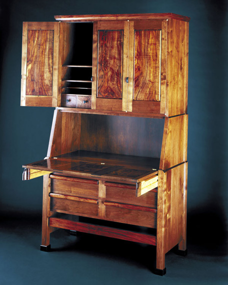 Fall-front Desk made from Claro Walnut, Eastern Black Walnut, Ebony, Burl (fall-front), and Beech. Desk includes several hidden compartments. (78"h x 42"w x 20"d)